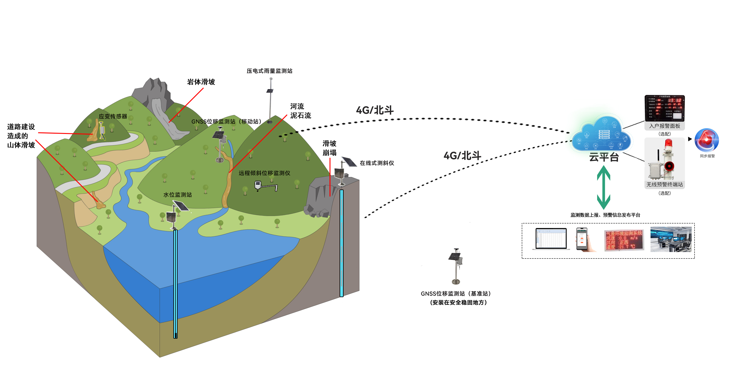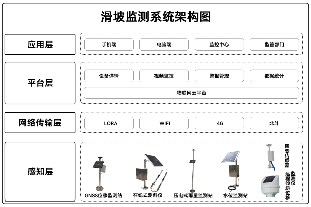 感知层:实时感知地质环境的状态变化,如水平位移、内部位移、沉降、降雨量、应力等前端感知设备;