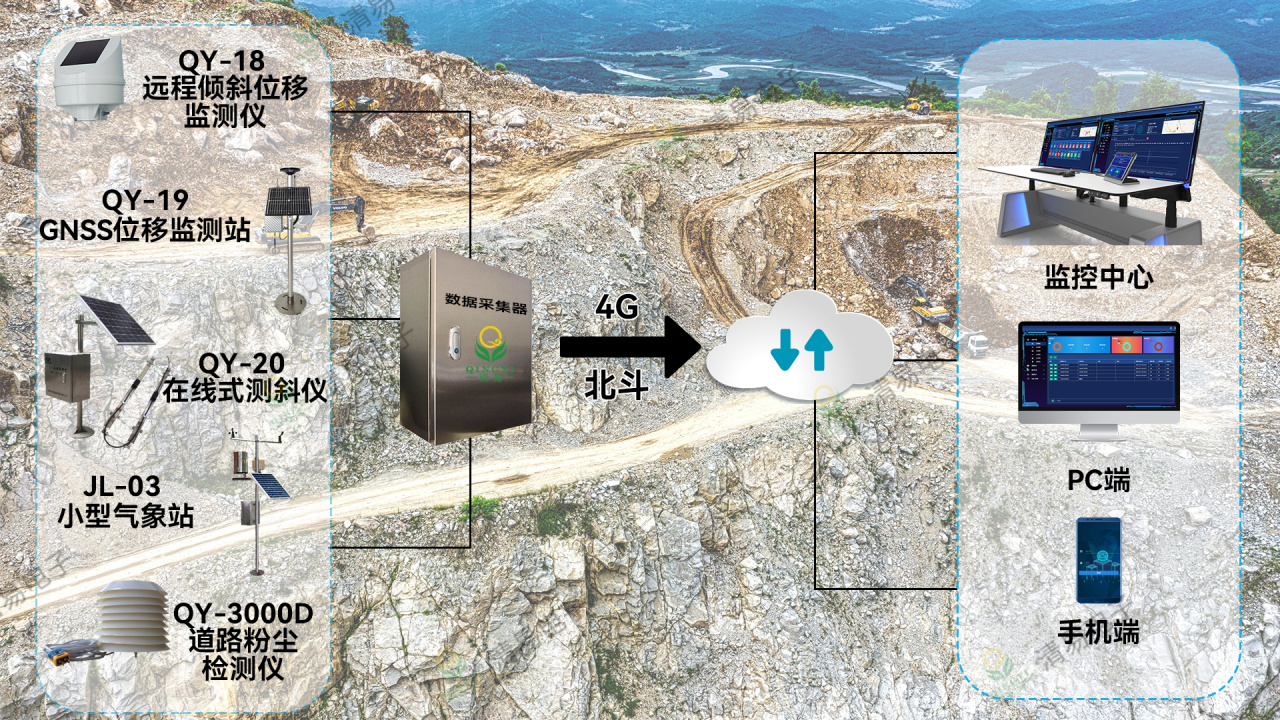 包括GNSS位移监测站、在线式测斜仪、远程倾斜位移监测仪、小型气象站和道路粉尘检测仪等各种传感器,用于采集矿山的各种监测数据。