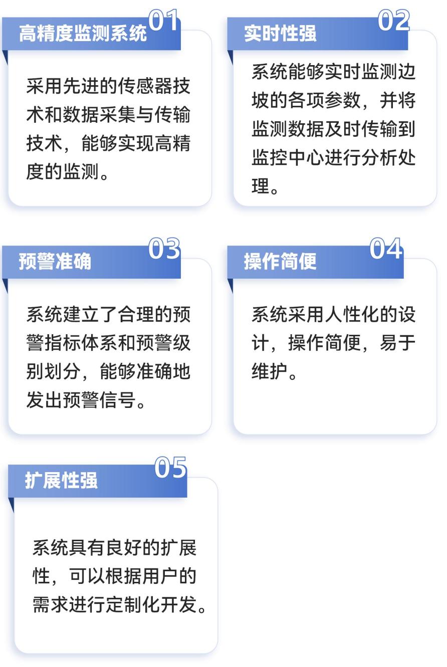 3、预警预报:系统能够根据预警指标体系,对边坡的稳定性进行评估,并在监测数据超过预警值时,自动发出预警信号。
